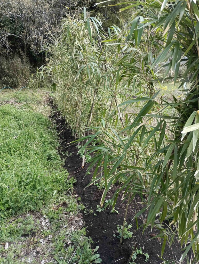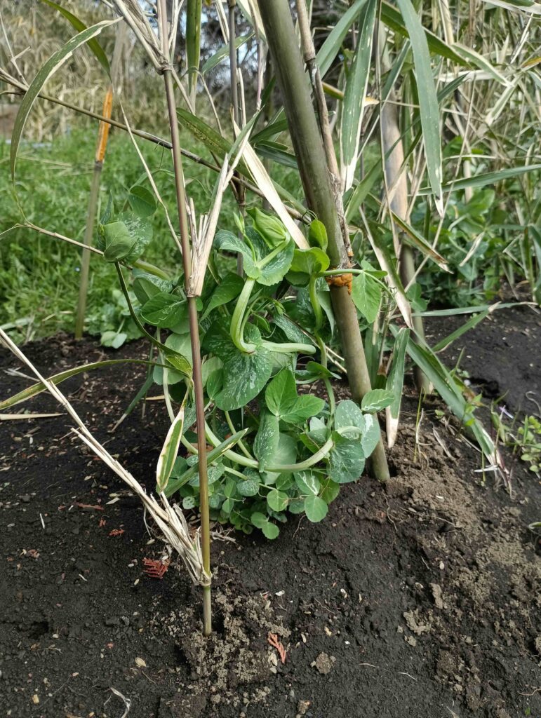 効率が悪いけれど、これが一番鳥の食害が少なく、風からエンドウを守ってくれます。